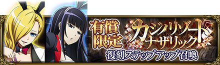 ・『有償限定カジノリゾートナザリック復刻ステップアップ召喚』『カジノリゾートナザリック復刻ステップアップ召喚』『カジノリゾートナザリック復刻召喚』では、★3および★4の「キャラクター」も排出されます。