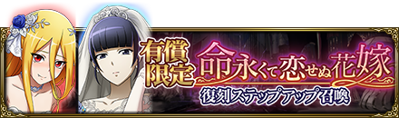 ・『有償限定命永くて恋せぬ花嫁復刻ステップアップ召喚』『命永くて恋せぬ花嫁復刻ステップアップ召喚』『命永くて恋せぬ花嫁復刻召喚』では、★3および★4の「キャラクター」も排出されます。