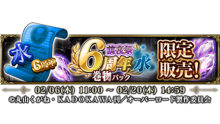 厳選された水属性の限定★5キャラからお好きな1体が選べる『6周年前夜祭水属性交換巻物』や、混沌石などがまとめて手に入る