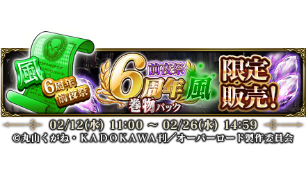 厳選された風属性の限定★5キャラからお好きな1体が選べる『6周年前夜祭風属性交換巻物』や、混沌石などがまとめて手に入る